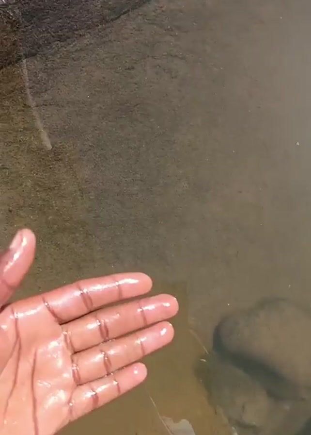 A close-up shot shows a dark-skinned hand entering clear water. Ripples form around the hand as it moves in the water. The bottom of the pool is visible, revealing a sandy or muddy texture with a few small rocks. Light refracts through the water, creating patterns on the hand. The pool appears to be shallow, and the overall environment seems natural.