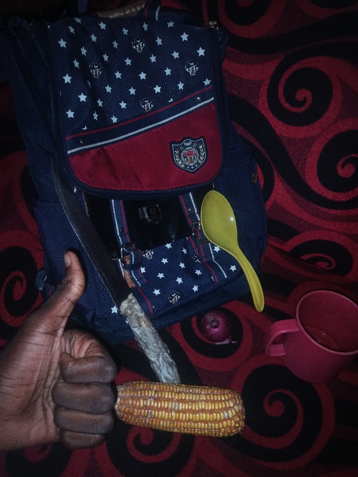 This scene, located in Narayi, Nigeria, displays a collection of items arranged on a dark red surface with black swirling patterns. A dark-skinned human hand is positioned in the lower-left, giving a thumbs-up gesture. Immediately to the right of the hand, a dried ear of yellow corn rests horizontally. Above the corn and partially obscured by the hand, a machete with a light-colored, possibly wrapped, handle lies diagonally across the image. In the upper-center, a blue backpack or bag with white star patterns and a red flap featuring a crest logo is visible. A yellow plastic spoon lies on top of the backpack flap. To the right of the machete's handle, a single small red onion is present. A pink plastic mug is situated in the lower-right corner of the frame.