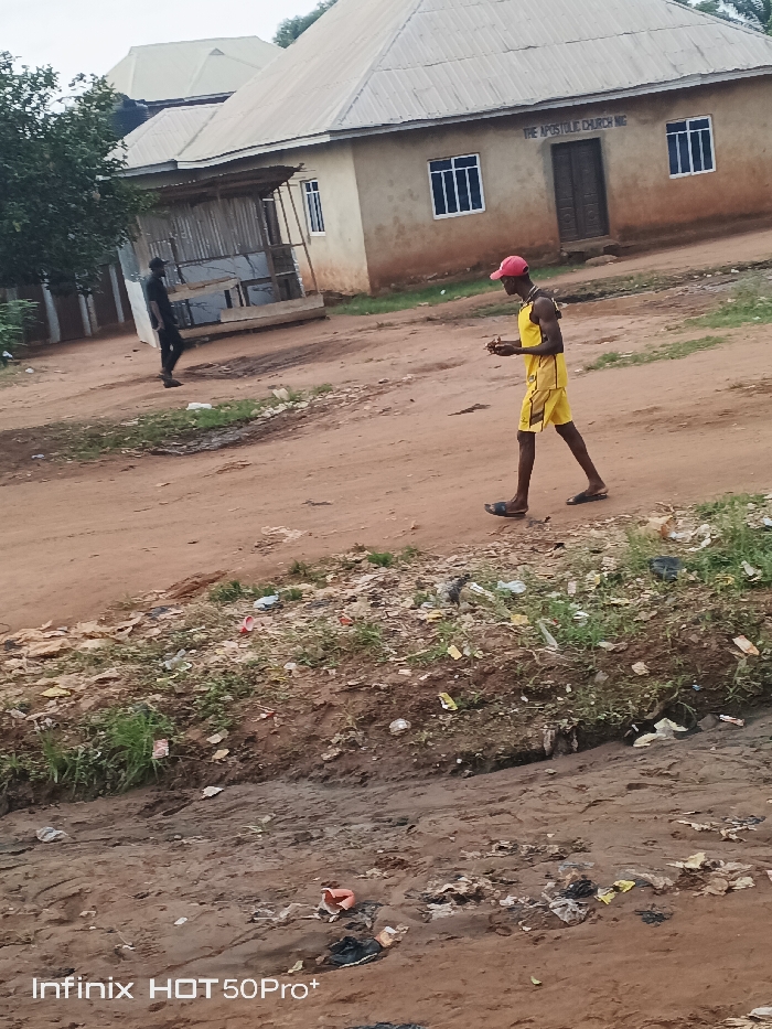 A dirt road leads to a church with a corrugated metal roof. A man wearing a yellow outfit and a red hat walks along the road. Another man dressed in black walks along the side of the road. A dilapidated shack sits next to the church. Trash and debris litter the ground on both sides of the road.