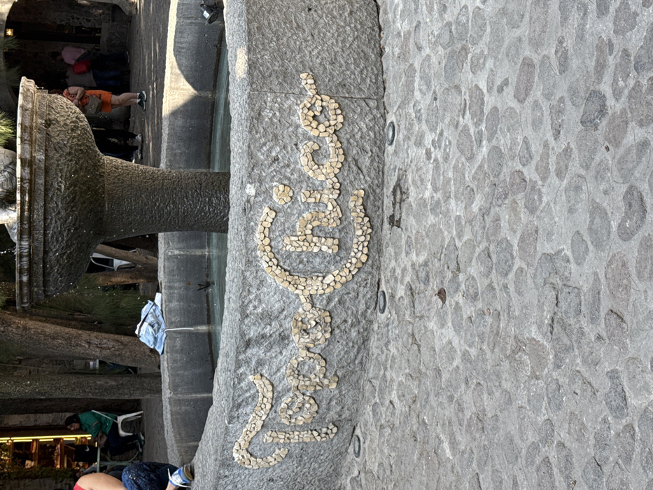 A vertical shot presents a stone fountain adorned with mosaic-style lettering in white. The letters, reminiscent of Arabic script, are formed from small stones. The fountain's base, constructed from grey stone, contrasts with the surrounding cobblestone pavement. A partial view of the fountain's basin is visible to the left, alongside background scenery including greenery and blurred human figures. The photo is captured in daylight, showcasing the rough texture of the stone materials.