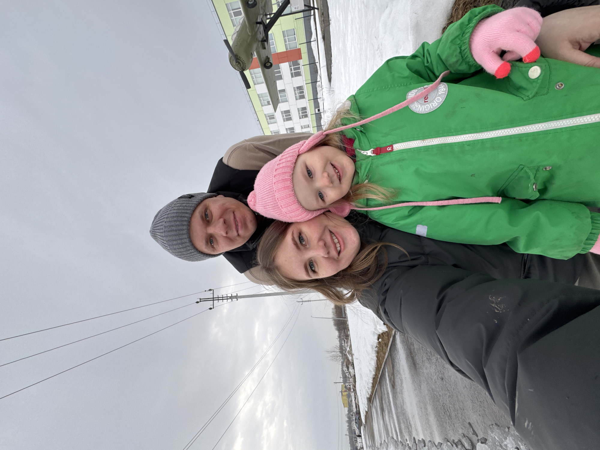 A selfie-style photograph depicts three individuals—two adults and one child—outdoors in what appears to be a cold-weather environment in Горный, Russia. The subjects are positioned from left to right: a woman, a young girl, and a man partially visible behind them. All three are smiling and looking towards the camera. The woman on the left has light brown hair, blue eyes, and is wearing a dark, possibly black, puffer jacket. She holds the camera, with her right arm extending towards the left of the frame. A smudge is visible on her jacket sleeve. In the center is a young girl, approximately 4-6 years old, with blonde hair, blue eyes, wearing a pink knitted hat with ear flaps and a chin strap, a bright green hooded winter coat, and pink fingerless gloves. The coat has a white zipper and a round patch on the right chest with "ORIGINAL KIDS 194_" partially visible. Behind the woman and girl, partially visible, is a man with short, light brown hair, blue eyes, wearing a grey knitted beanie and a dark vest over a light-colored long-sleeved shirt. The background indicates a semi-urban setting with snow on the ground. To the immediate right of the subjects, a light green, propeller-driven aircraft, likely a monument or display, is visible on a stand. Behind the aircraft is a multi-story building with a light green upper facade and white lower sections, featuring multiple windows. To the left of the subjects, a paved or asphalt path/road, partially covered with ice and slush, extends into the distance. Accumulated snow is present along the edge of the path. Utility poles with multiple overhead power lines traverse the scene from left to right under an overcast, grey sky. In the mid-ground to the left, distant buildings and sparse trees are visible on a slightly elevated terrain.