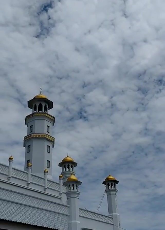 top of a white mosque with gold domes and a minaret against a sky filled with puffy white clouds. The camera pans slightly to show more of the mosque's architecture. There are birds perched on the domes. The building is partially obscured by a dark overhang at the bottom of the frame.