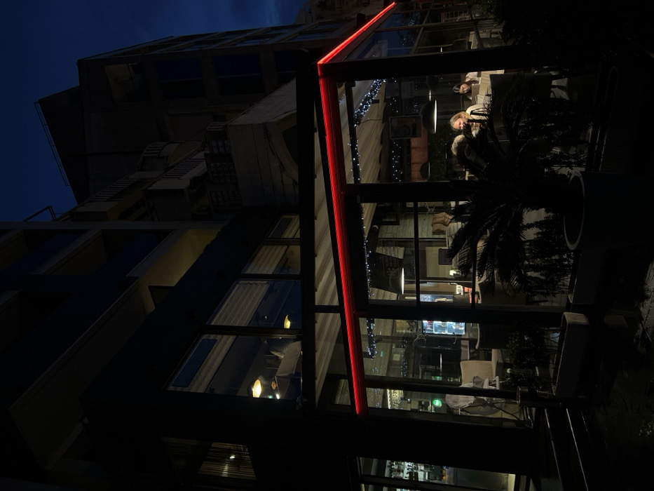 The image displays an urban street scene at night in Budva, Montenegro, featuring a modern, multi-story building. The ground floor houses a glass-enclosed establishment, likely a restaurant or cafe, distinguished by a continuous red LED strip illuminating its upper perimeter. Above this, the building's upper floors are largely dark, revealing multiple balconies and windows, with faint interior lighting visible on the first floor. The sky overhead is a deep twilight blue. Inside the brightly lit ground-floor establishment, several hanging pendant lamps and white decorative string lights illuminate the space. At least three individuals are present. On the right side, two women are seated at a table; the woman closer to the viewer has light-colored hair and is smiling, while the other woman is partially obscured. These individuals appear engaged in a social interaction. Further to the left, a bar area with bottles and glasses is discernible. Potted plants, including a small palm-like specimen, are situated both within the establishment and immediately outside the glass facade in dark planters. The ground surface directly in front of the building is dark and reflective, consistent with wetness.