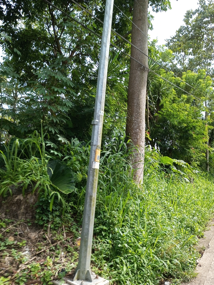 The image depicts an outdoor, vegetated roadside scene in Kandenuwara, Sri Lanka. A hexagonal, metallic utility pole, weathered and possibly galvanized steel, stands anchored in the foreground, slightly left of center. A yellow and white adhesive label with black alphanumeric characters and a QR code is affixed to its mid-section. Dense green vegetation, primarily tall grasses and various leafy plants, covers the ground to the right of the pole and recedes into the mid-ground. A large, dark green, fan-shaped leaf is visible behind the pole. Further right, a thick, light-brown tree trunk with a smooth bark texture rises vertically. Multiple dark, horizontal utility lines are stretched across the mid-portion of this tree trunk. The immediate ground area to the far left reveals exposed soil, sparse dry leaves, and a partial concrete or stone retaining wall overgrown with small plants. A textured concrete or paved strip, indicative of a sidewalk or road edge, is visible at the bottom right of the frame. The background is dominated by a dense canopy of varied green trees, with limited clear sky visible above. No human or animal subjects are present; no actions or interactions are depicted.
