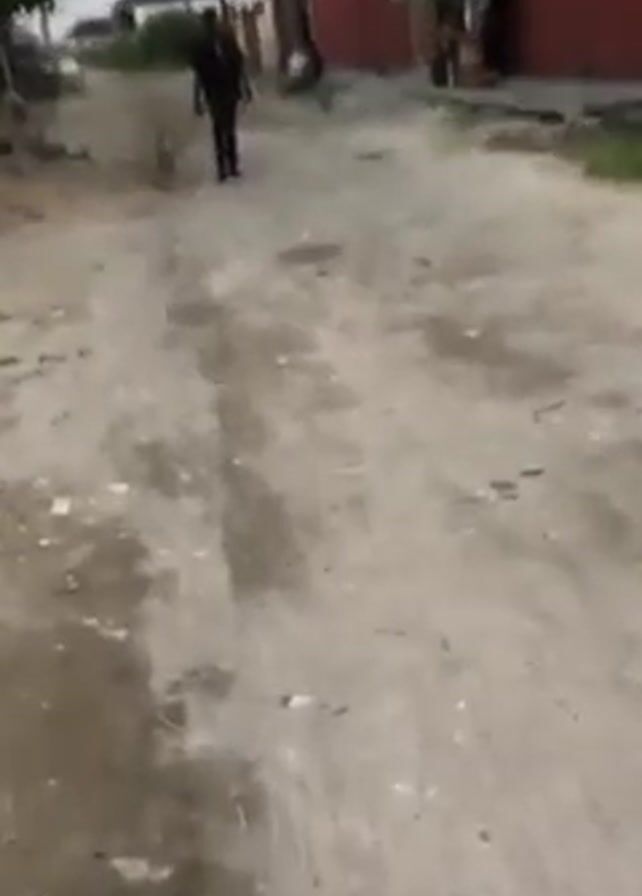A man in dark clothing walks along a dusty road followed by a medium-sized tan dog. The road has some puddles of water. There are buildings on either side of the road, including a brick building on the right. There is a green canopy structure near the brick building. Utility poles are visible in the background. The sky is overcast.