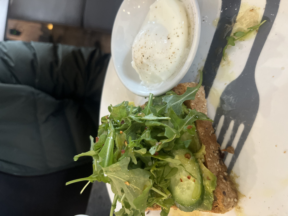 A plate presents a single slice of seedy toast topped with avocado, greens, and chili flakes. Adjacent to the toast is a small white bowl containing a poached egg seasoned with pepper. A fork shadow is visible on the plate. Part of a dark green coat is in the background. The scene suggests a brunch or light meal setting.