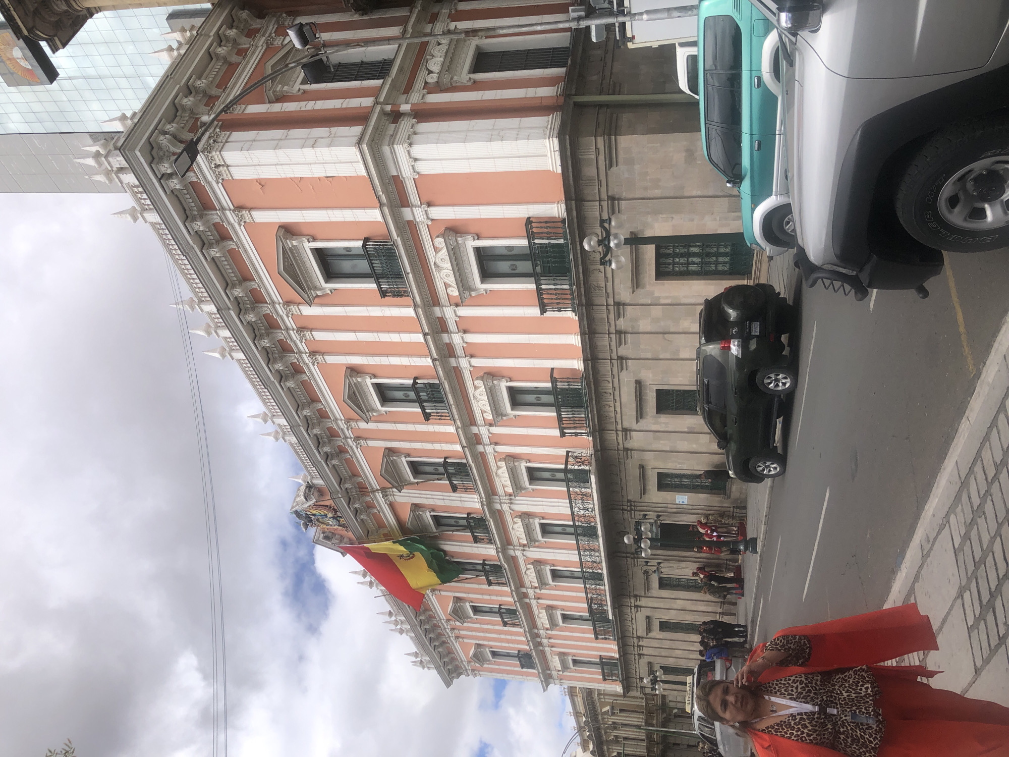 Here is a detailed description of the image: The image captures a street scene in what appears to be La Paz, Bolivia, featuring a prominent building with ornate architectural details. The building has a salmon-colored facade with white vertical stripes, multiple windows, decorative moldings, and a roofline adorned with pointed ornamentation. The Bolivian flag hangs from one of the balconies. On the right side of the frame, a street with several parked vehicles is visible. These include a black SUV, a light blue pickup truck, and a silver car. A woman wearing a red coat and a leopard-print top stands on the sidewalk in the foreground. Her attention appears to be directed toward the camera. The sidewalk is constructed of light-colored, patterned paving stones. In the background, figures of people can be observed near the building's entrance and along the street. Streetlights are visible, flanking the entrance of the building. The sky is overcast with clouds, hinting at potential weather conditions. The scene is a mix of urban activity, architectural grandeur, and personal presence, offering a snapshot of life in La Paz.