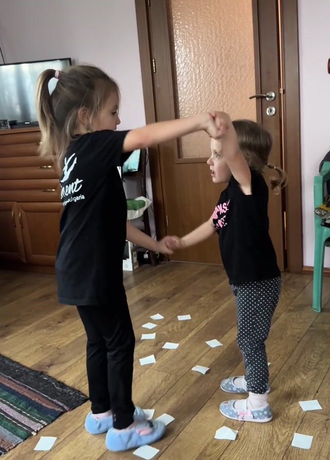 Two young girls are dancing in a room. The older girl is wearing a black shirt with a white graphic, black pants, and light blue slippers. She has her hair in a ponytail. The younger girl is wearing a black shirt with a pink graphic, polka-dot leggings, and light blue slippers. Her hair is in pigtails. They are holding hands and moving back and forth. Small white pieces of paper are scattered on the wooden floor. A television and dresser are visible in the background, along with a closed brown door and a green chair.