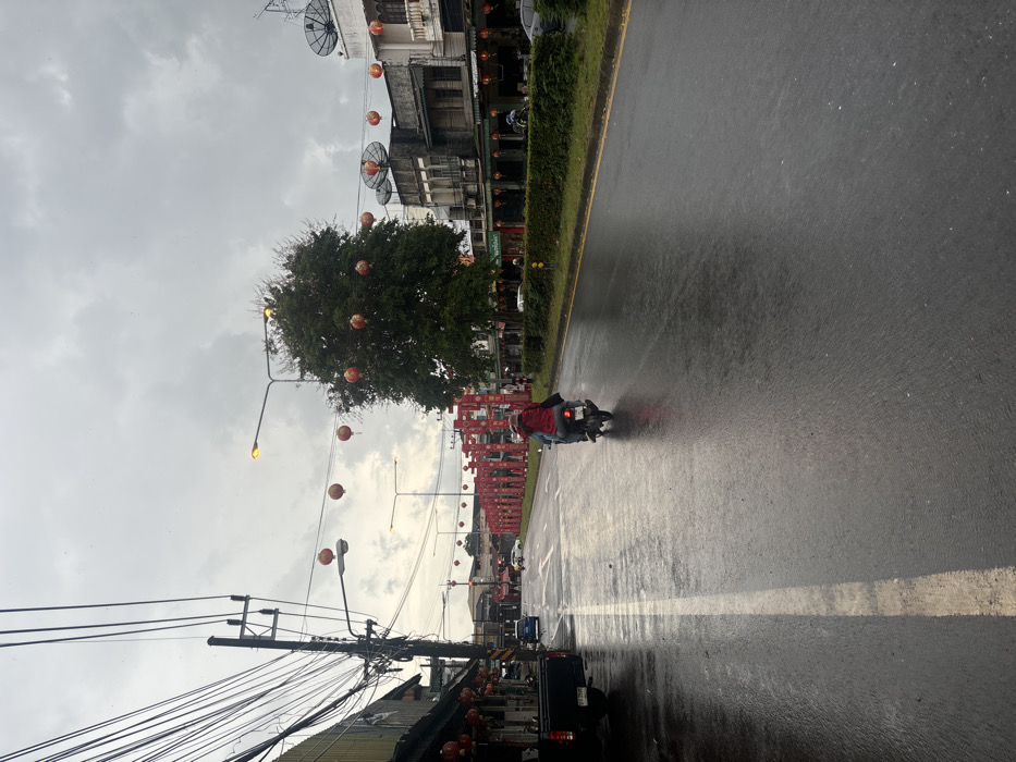 The image depicts a street scene in Thung Yao, Thailand, under an overcast, grey sky. The asphalt road surface is visibly wet, reflecting ambient light, indicating recent rainfall. In the immediate foreground, slightly right of center, a single individual on a dark-colored motorcycle travels away from the viewer. The driver wears a light-colored helmet and dark clothing, with a prominent red item, likely a backpack or a covered seat, visible on the rear of the motorcycle. The street is extensively decorated with numerous red Chinese lanterns, strung both across the road at various intervals and along the facades of buildings. Further down the street, a series of tall, red decorative archways form a distinct ceremonial gateway. On the left side of the street, a dense array of utility wires emanates from a tall utility pole, extending across the street and along the buildings. Below the wires, a row of older, two-story commercial buildings with varied storefronts is visible. A dark-colored pickup truck is parked on the left side of the road, with other vehicles discernable further in the distance. On the right side of the street, a large, mature tree with dense green foliage stands, partially obscuring the view of the buildings beyond. Adjacent to the road, a neatly trimmed green hedge separates the thoroughfare from the sidewalk area. Beyond the hedge, a continuous line of older, multi-story buildings, some featuring multiple satellite dishes on their rooftops, lines the street. One streetlight on the right side emits a warm yellow glow. The scene captures an active urban environment, characterized by traditional architecture and cultural decorations, under wet weather conditions.