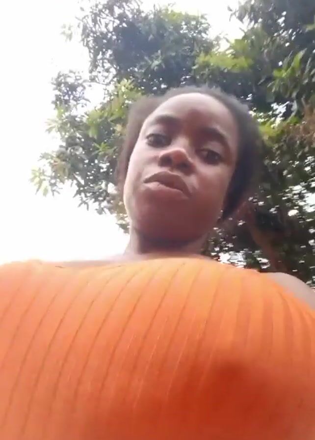A woman with brown skin and dark hair is recording a selfie video while standing outdoors. She is wearing an orange ribbed top. The camera is pointed up at her, showing the sky and treetops in the background. She looks up and then down at the camera. The camera moves slightly as she holds it. The sky is overcast.