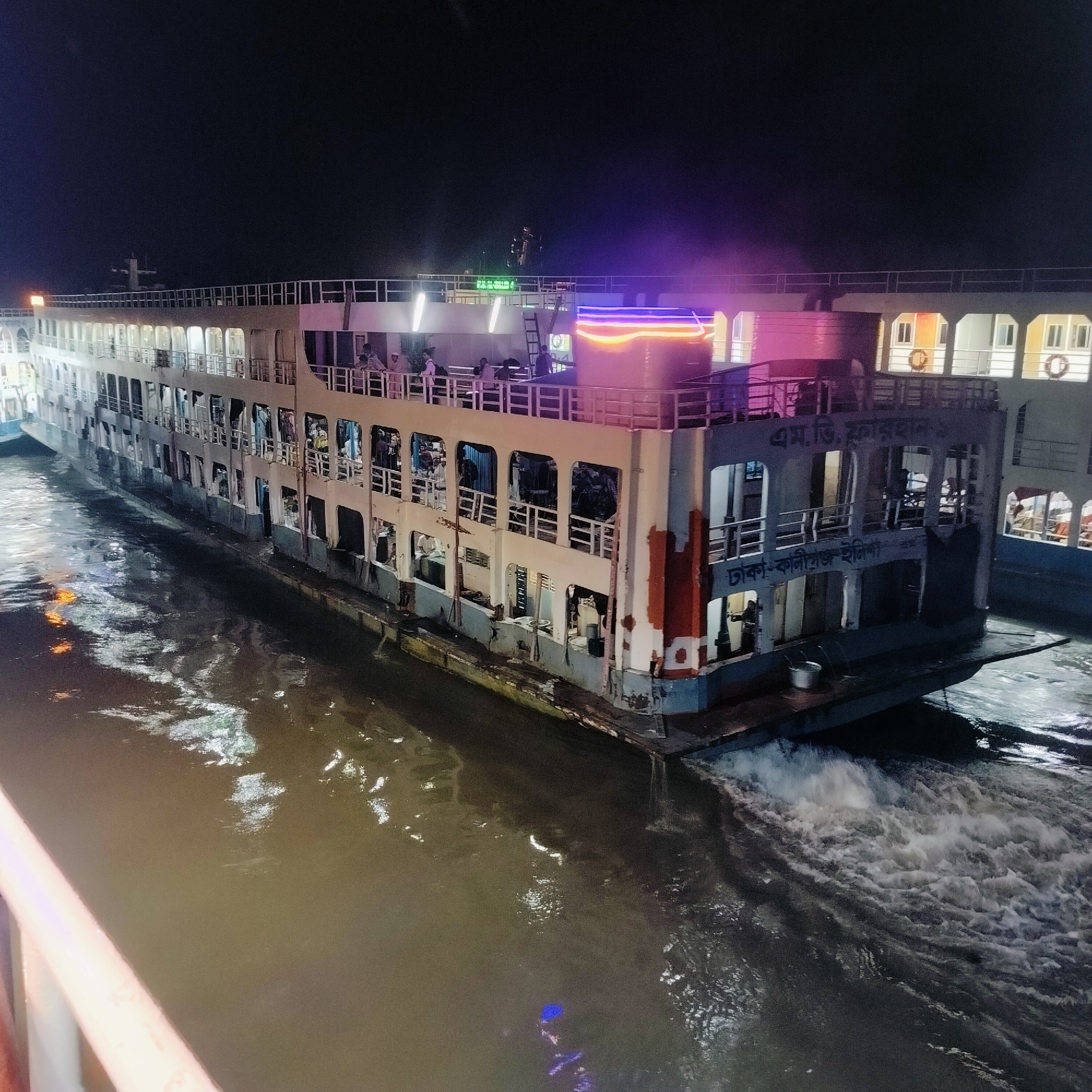 A large, multi-deck passenger vessel, identified by the Bengali text "এম.ডি. ফরহান-২" (M.D. Farhan-2) and "ঢাকা-ভোলা/ইলিশা" (Dhaka-Bhola/Ilisha), traverses a waterway at night, likely near Bhola, Bangladesh. The vessel displays a white superstructure with grey and blue lower hull sections, showing visible wear and rust streaks, particularly a prominent reddish-brown area on the stern quarter. Numerous rectangular windows and open deck areas are visible across multiple decks, illuminated from within by artificial light, casting reflections on the dark water. Several individuals are present on the upper and lower decks, some standing along railings, others visible inside the illuminated compartments. Decorative pink/purple and orange strip lighting adorns the upper structures. Two white lifebuoys are visible on the vessel's far side. Water churns at the stern, indicative of propeller wash, suggesting the vessel is in motion or its engines are operating. The scene is dark, illuminated primarily by the vessel's lights and their reflections on the water, with a very dark, unlit sky overhead.