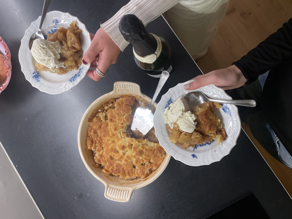An overhead shot captures a table setting with a baked crumble, likely apple, in a round earthenware dish. Silver utensils rest alongside the dish. Two plates with portions of the crumble, each topped with a scoop of ice cream, are held by people. A bottle of wine, possibly champagne, lies on the dark countertop. The plates are decorated with a blue floral pattern. The scene suggests a gathering or dessert being served.