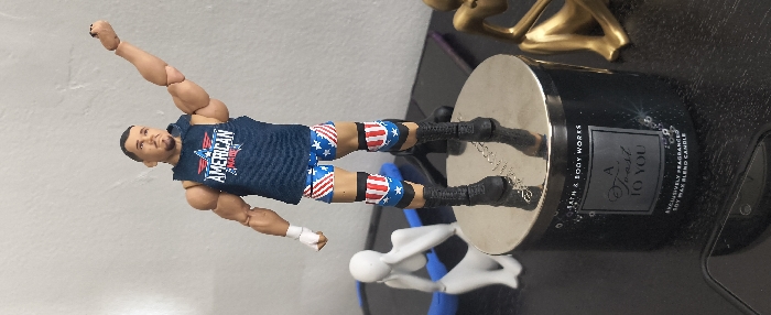 A forensic examination reveals an action figure, likely representing a professional wrestler, standing centrally on the reflective metallic lid of a dark, cylindrical Bath & Body Works "A Toast to You" soy wax blend candle. The action figure, a light-skinned male with a dark goatee, is dressed in a dark blue sleeveless hooded top featuring "AMERICAN MADE" and a red, white, and blue star-and-wings emblem. He wears blue shorts adorned with white stars and red and white stripes, black boots, white wrist tape on his left forearm, and blue and black knee pads with a red and white striped pattern. His left arm is raised with a clenched fist, and his head is slightly tilted upward and to the right. To the left of the candle, a white stylized human figure sculpture is hunched over, with a blue abstract object positioned behind it. To the right, a gold-colored stylized human figure sculpture is partially visible, appearing to be in a similar hunched pose. All subjects are situated on a dark, flat surface against a light-colored wall. The scene is located in Cutler Bay, United States of America.
