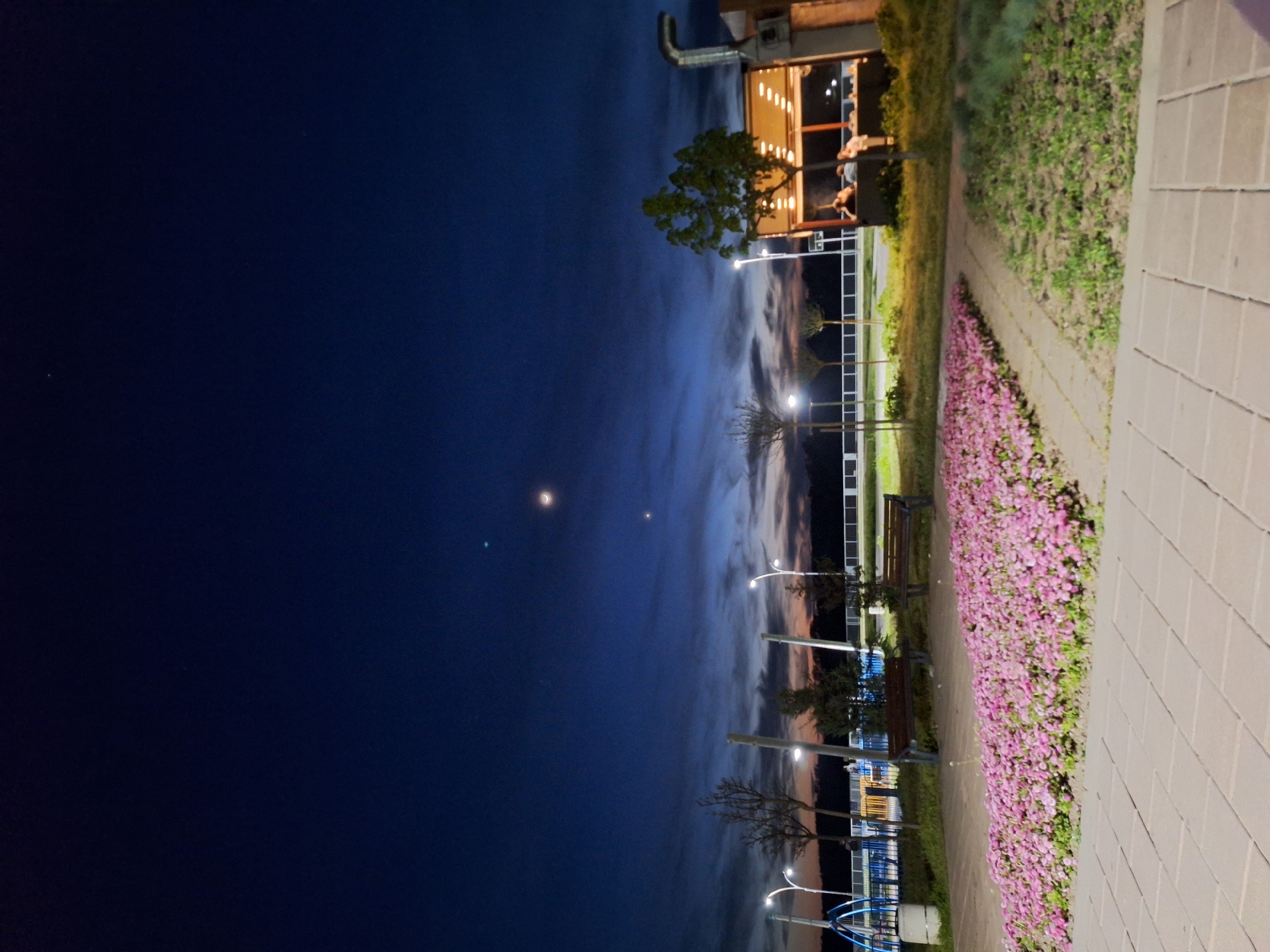 The image depicts a night scene in Ruse, Bulgaria. The sky is deep blue with scattered clouds and faint celestial bodies, including the moon and a possible planet or star. The lower portion of the image shows a well-lit pedestrian pathway lined with pink flowers and benches. Streetlights illuminate the path and surrounding trees. A building with illuminated windows and a prominent rooftop structure is visible on the upper right of the image. No people are clearly visible, though figures can be observed on the building. The foreground features a paved walkway.