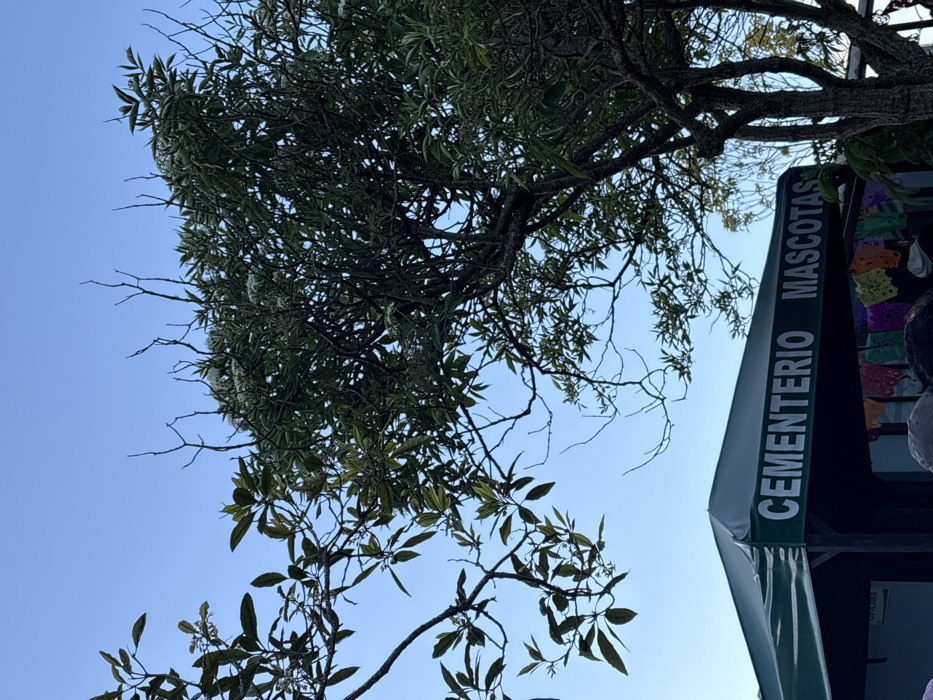The image depicts an outdoor scene in Casco Urbano, Colombia, under a clear blue sky. Dominating the upper and central portions of the frame are the branches and green foliage of two trees, one with visible small white blossoms. Beneath the trees and extending across the lower half of the image is a dark green canopy or tent structure. White lettering on this canopy clearly reads "CEMENTERIO MASCOTAS." Below the canopy, a line of colorful paper decorations, resembling papel picado, is strung. The top of several individuals' heads and shoulders are visible at the very bottom edge of the frame, positioned beneath the decorations, indicating a gathering. No specific actions or interactions are discernible among the obscured individuals.