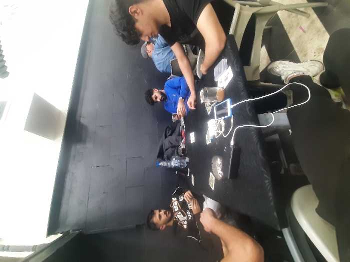 Four men are seated around a black table playing cards. A blue phone is on the table, along with playing cards, a drink, and a power bank. One man is wearing a black shirt, another is wearing a blue shirt, and one is wearing a black and white shirt. A water bottle is on the table. A checkered floor is visible in the background.