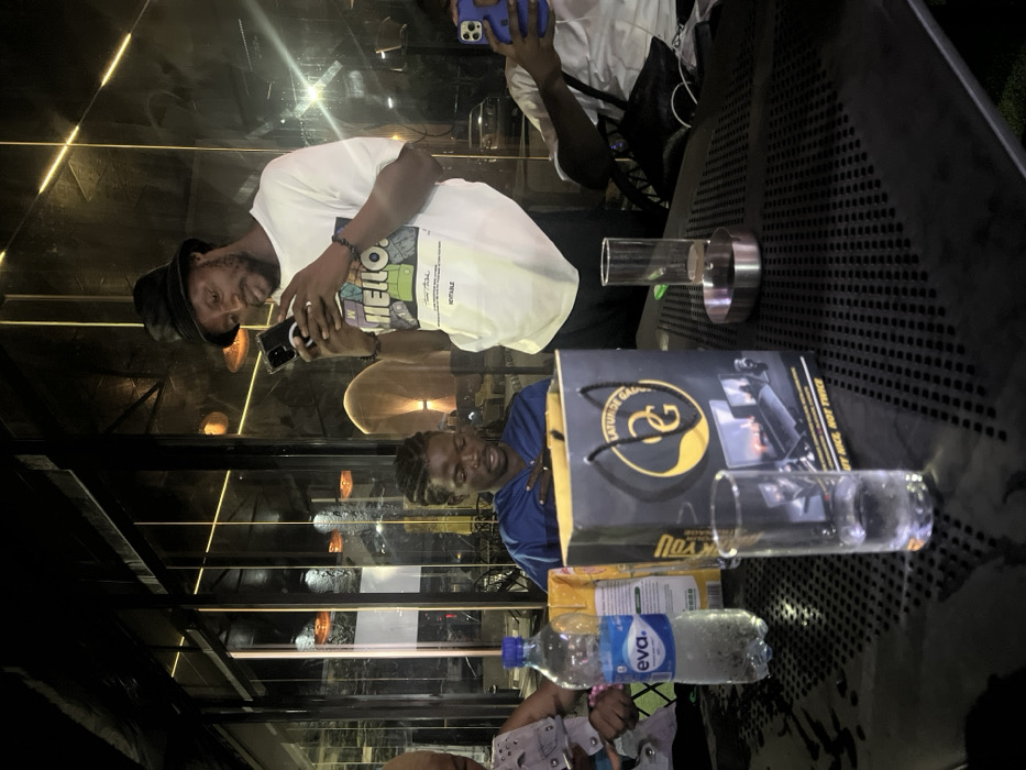 The scene depicts four individuals gathered around a dark, perforated metal table at night within a commercial establishment, likely a restaurant or cafe, situated in Ikeja, Nigeria. In the center, a standing adult male with a dark skin tone and a beard wears a black bucket hat, a white t-shirt with a colorful "HELLO" graphic, black pants, and dark beaded bracelets. He is focused on a black-cased smartphone, holding it with both hands and actively interacting with its screen. A circular magnetic accessory is visible on the phone's back. To his left, a seated adult male with dark skin and braided hair wears a blue shirt. He looks down at an unseen object in front of him, with his hands held near his chest. Partially visible on the far left is the arm and shoulder of another seated individual, wearing a light-colored, possibly textured, top. On the far right, another person's arm and torso are visible, wearing a white shirt and holding a light blue-cased smartphone in both hands, also looking at its screen. The table holds a clear plastic bottle of "Eva" mineral water, approximately half full with visible condensation. Next to it is a yellow package, partially obscured. A prominent black paper shopping bag with gold "LATUNDE GOLD" branding and an "LG" logo displays images of laptops and "BUY NICE, NOT TWICE" text. Two tall, clear glasses, one containing a small amount of liquid, and a small, empty, silver oval ashtray are also on the table. The background features a glass wall or window reflecting interior lights, including multiple orange-toned pendant lights and linear strip lighting. Through the glass, faint outlines of vehicles and further lights are visible, indicating an urban or commercial setting at night. The establishment appears modern.