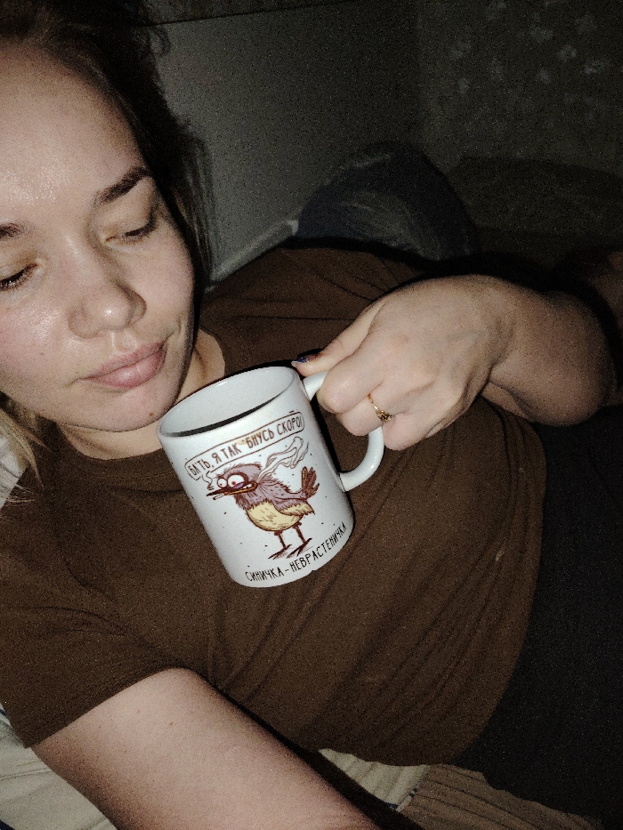 A woman with closed eyes holds a white mug with a cartoon bird on it. The bird is depicted with a cigarette in its beak and the Russian text says “Damn, I’ll get drunk soon, a neurotic chickadee”. The woman is wearing a brown t-shirt and a gold ring on her finger. She appears to be lying down, possibly in bed, as indicated by the bedding visible at the bottom. The background is dark and blurry.