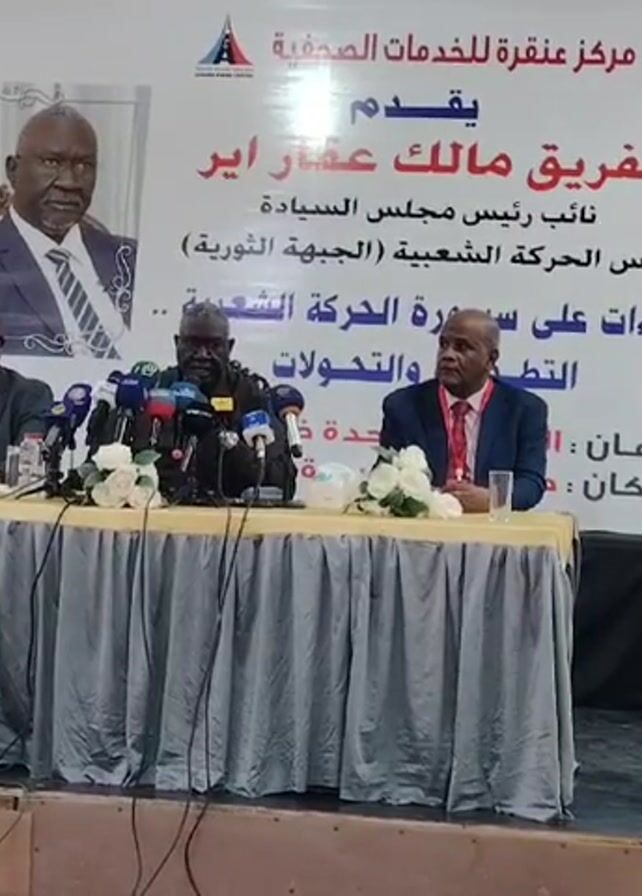 Three men are seated behind a table covered with a gray cloth. They are facing the camera. Each man has a microphone in front of him. There are white flowers on the table. Behind the table is a large sign written in Arabic. A man in a blue uniform sits on a chair on the right side of the frame. The background is white.