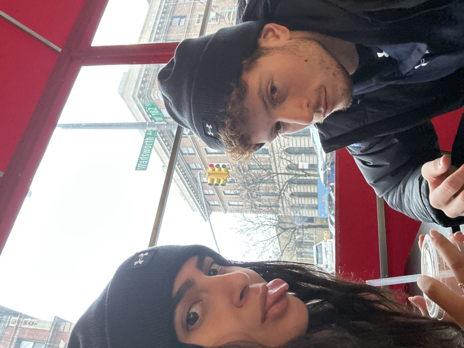 Two people wearing black beanies sit inside a building. Outside the window, the street sign shows Wadsworth Avenue and W 182nd Street. A traffic light and older buildings are visible. The person on the bottom left has dark hair and is sticking out their tongue. The person above them has light hair and a beard. They're both wearing jackets. A plastic cup and straw are visible near the bottom right of the frame. The photo is taken at a tilted angle.