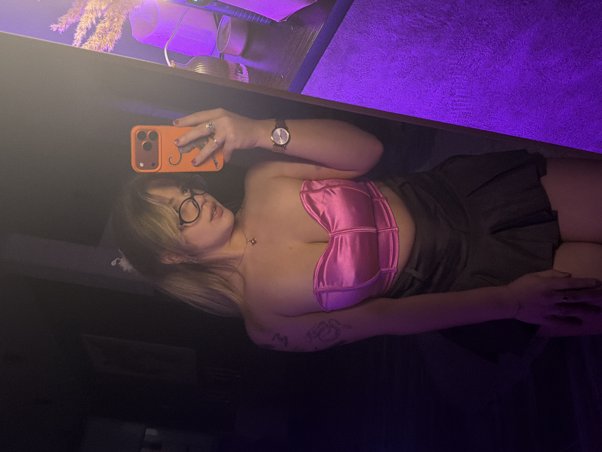 A woman with light-blonde hair and glasses is taking a selfie in a mirror. She is wearing a pink satin corset top and a dark skirt. She is holding an orange smartphone with a leopard design on the case. She is wearing a watch and rings. There is a decorative plant and purple light in the background. The location cannot be confirmed to be Большая Шильна, Russia, from the image alone.