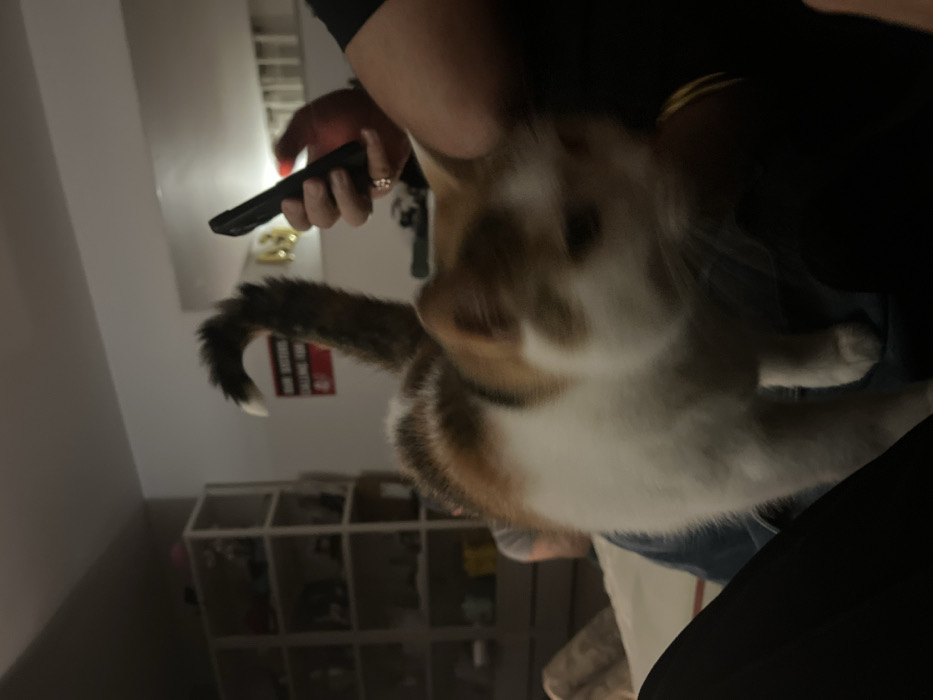 A blurry photo features a calico cat, mostly white, held up by a person. The person is holding a black phone and has a ring on their finger. The cat's tail is curled up and it appears to be moving quickly. In the background is a white cube storage unit and a fire extinguisher. The image is dark and somewhat out of focus.