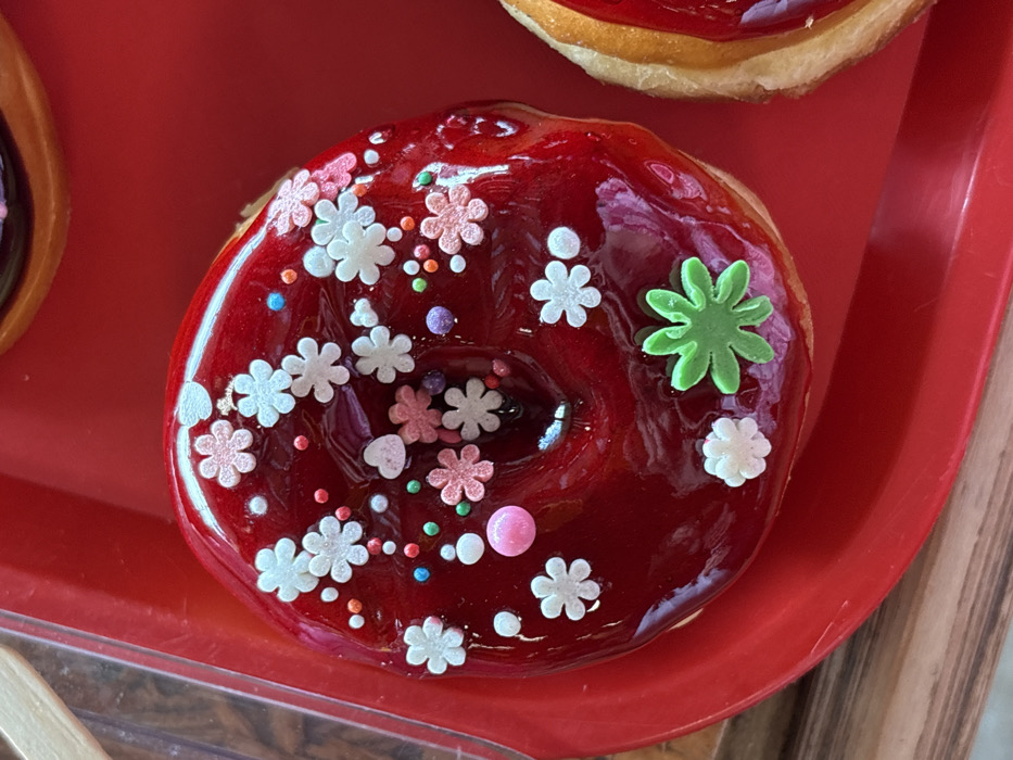 - "The image displays a close-up, top-down view of a donut with a glossy, deep red glaze and diverse decorative sprinkles, positioned on a bright red plastic tray in Tsovagyugh, Armenia" by FM-LN1lQ2, licensed under CC BY 4.0