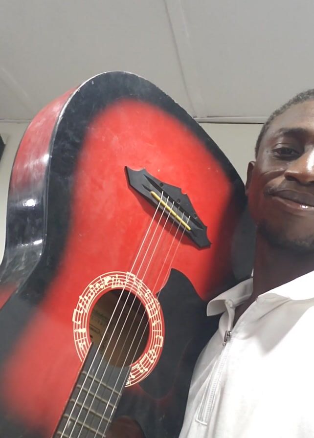 A man with a short haircut and wearing a white jacket is holding a red and black acoustic guitar. The guitar is held diagonally with the body of the guitar partially obscuring the man's body. The man is looking into the camera with a slight smile. The background is a plain white wall. A blurred object, potentially clothing, is visible behind the man's shoulder. The lighting is bright and appears to be indoor. The camera angle is low, looking up at the man and the guitar.