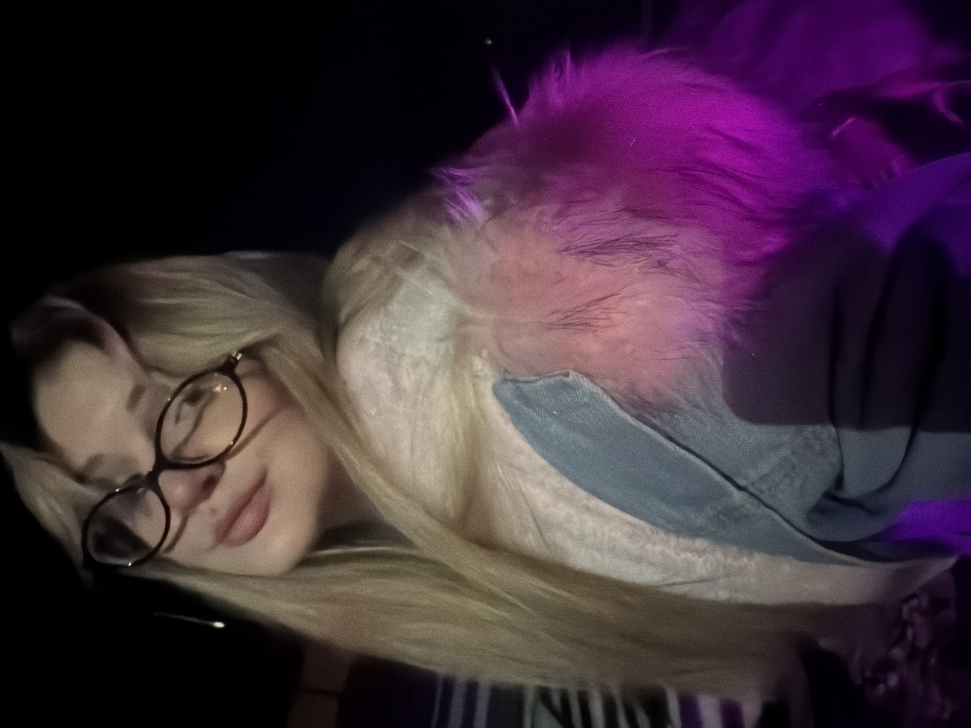 A woman with blond hair and glasses is lying down. She is wearing a jacket with a furry collar. The lighting is dark with some purple hues. The image location is listed as being in Большая Шильна, Russia.
