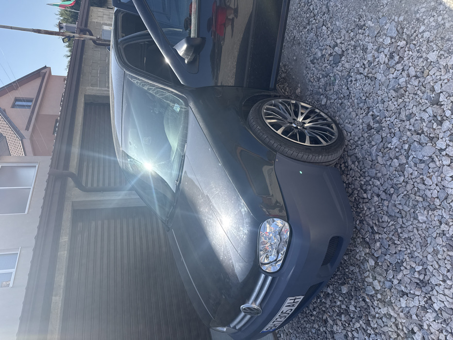 An outdoor, daytime scene in the city of Войводино, Bulgaria, depicts a dark-colored (likely black) four-door Volkswagen Golf, likely a Mk4 generation model, parked on a light grey gravel surface