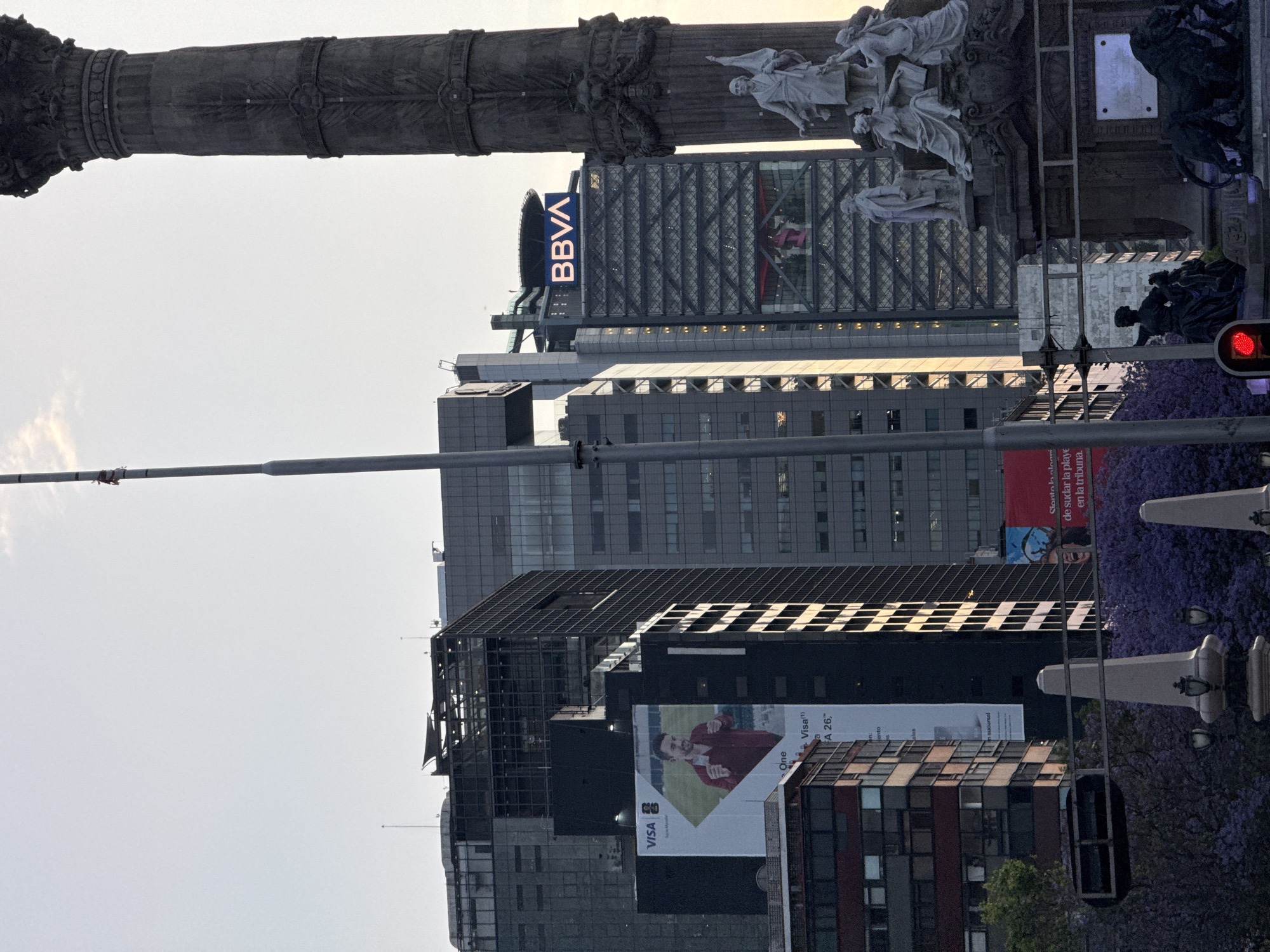 The image depicts a dense urban landscape in Mexico City, Mexico, centered on a prominent national monument. The scene is dominated by a large, dark-toned stone column, identified as the Angel of Independence, with intricate classical carvings and a multi-tiered base featuring numerous classical-style white and dark-colored statues of figures, including two large dark lion sculptures at the very bottom right. In the background, a cluster of modern high-rise buildings surrounds the monument. A prominent dark skyscraper features a lit "BBVA" logo in blue at its top, along with a helipad structure. Another tall building to the left displays a large "VISA" advertisement featuring a smiling man in a red shirt holding a card. Additional high-rise buildings of varying architectural styles and colors are visible throughout the background. In the lower midground, a dense canopy of purple-flowering trees, likely jacaranda, adds a distinct color element. The foreground includes dark street furniture: a tall, slender pole running vertically through the left-center, ornate light-colored streetlights, and a traffic light showing a red signal on the lower right, partially obscured by the trees. The sky is a light, pale blue with minimal cloud cover.