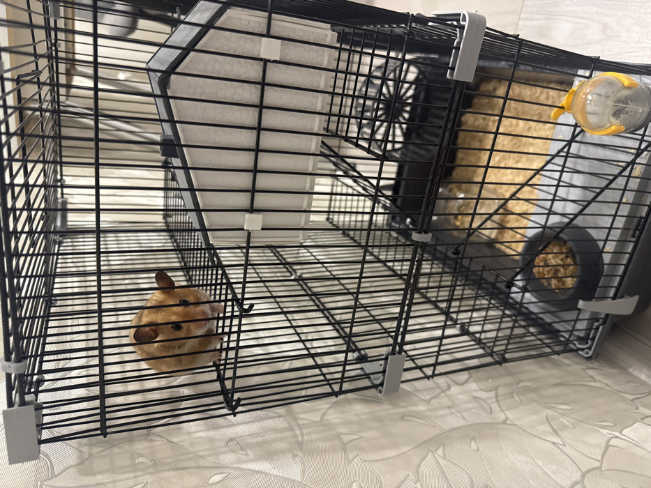 The scene depicts an indoor domestic environment, likely within a residence in Rostov-on-Don, Russia. The primary subject is a small, light brown hamster with darker brown ears and dark eyes, positioned on the second level platform inside a multi-tiered black wire cage. The hamster is facing forward, appearing to observe its surroundings. The cage is a tall, rectangular structure with horizontal and vertical black metal bars, interconnected with gray plastic clips. Inside the cage, visible accessories include a white and black plastic hamster house on the second level, below which a black plastic running wheel is situated. The bottom level of the cage contains a layer of light-colored bedding material, a dark gray circular food bowl filled with dry food, and a clear plastic water bottle with a yellow nozzle and holder. The cage is placed against a wall covered with light-toned wallpaper featuring a subtle, embossed floral or leaf pattern. To the right of the cage, a light-colored floor, possibly laminate or wood, is visible. No human subjects are present in the frame.