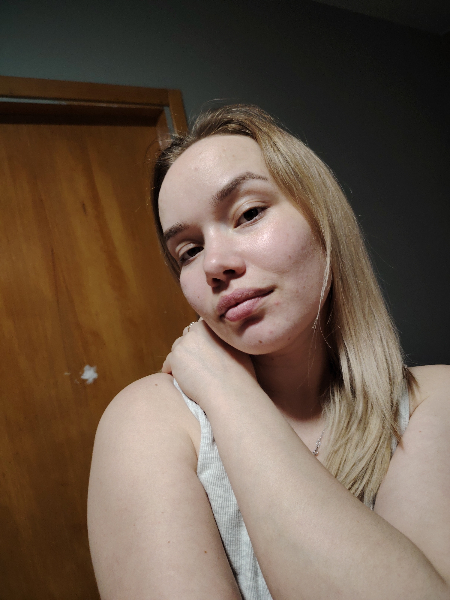 A young woman is captured in a close-up shot. She has fair skin, blonde hair, and is wearing a light-colored tank top. Her hand is resting on her shoulder. The background consists of a wooden door and a dark wall. The location mentioned, Марковский, Russia, cannot be verified from the image.