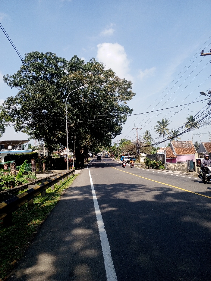 The scene is depicted as being in the city of Multhan, India, on a clear, sunny day with a bright blue sky and scattered white clouds. The perspective is from the side of an asphalt road, looking forward in the direction of travel. On the immediate left, a black and yellow metal guardrail runs parallel to the road, bordering a strip of green grass and foliage, including large banana leaves. Beyond this, a brick fence or wall is visible, leading to a multi-story building with a light blue and white facade. A tall, large-crowned tree with dense green leaves stands prominently in the mid-ground on the left, partially obscuring other trees. A light gray street light pole with a curved arm and a white fixture is positioned in front of this large tree. Overhead, numerous electrical and communication lines crisscross the upper left quadrant of the image. The asphalt road surface features a solid white line delineating a paved shoulder or bike lane on the left. Further to the right, a double solid yellow line marks the center of the two-lane road. Distinct, irregular shadows from overhead trees are cast across the road surface. Vehicles are visible traveling away from the camera. In the immediate foreground on the right, a person wearing a dark helmet and jacket operates a white motorcycle. Further down the road, two additional motorcycles, each with a single rider, are present in the right lane; one rider wears a red helmet. A light blue van or small truck is observed further in the distance on the right side of the road. On the right side of the road, utility poles with a dense entanglement of black overhead wires are prominent. Houses with terracotta-colored tiled roofs and light pink walls line this side of the road, set back from the pavement. Palm trees are visible in the background, interspersed with other green foliage. A sign with white text on a blue background is visible near the houses, displaying "Jl. RAYA SUKOWONO" along with other characters. The road continues into the distance, bordered by more trees and structures.