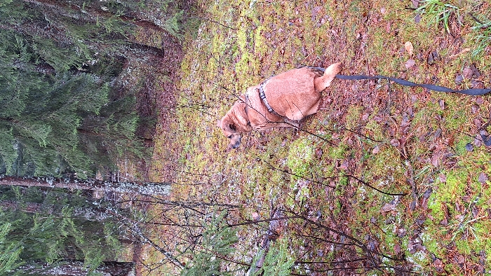 An image taken in a forest near Petriškė, Lithuania, depicts a medium-sized, tan-colored dog seated on a forest floor