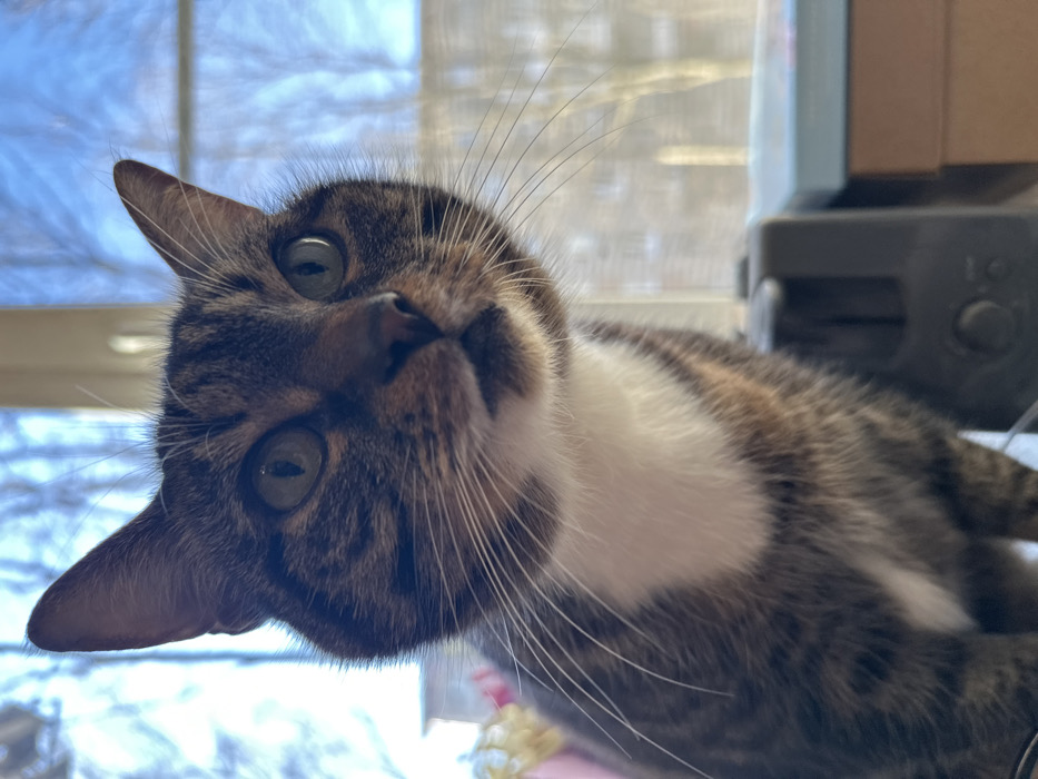 - "A domestic cat, exhibiting a brown and black tabby coat with a prominent white bib on its chest and belly, is depicted in a close-up, chest-up view" by FM-u0i422, licensed under CC BY 4.0