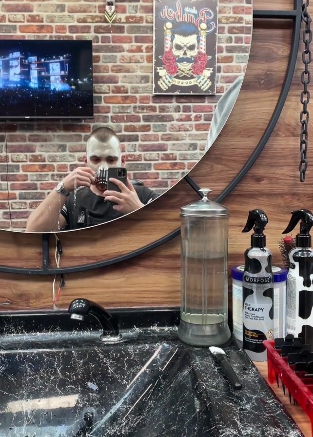 man in a barber shop taking a selfie in the mirror. He's drinking from a small glass, presumably tea. The barbershop has a brick wall, a TV playing in the background, and barbering equipment is visible around the sink.