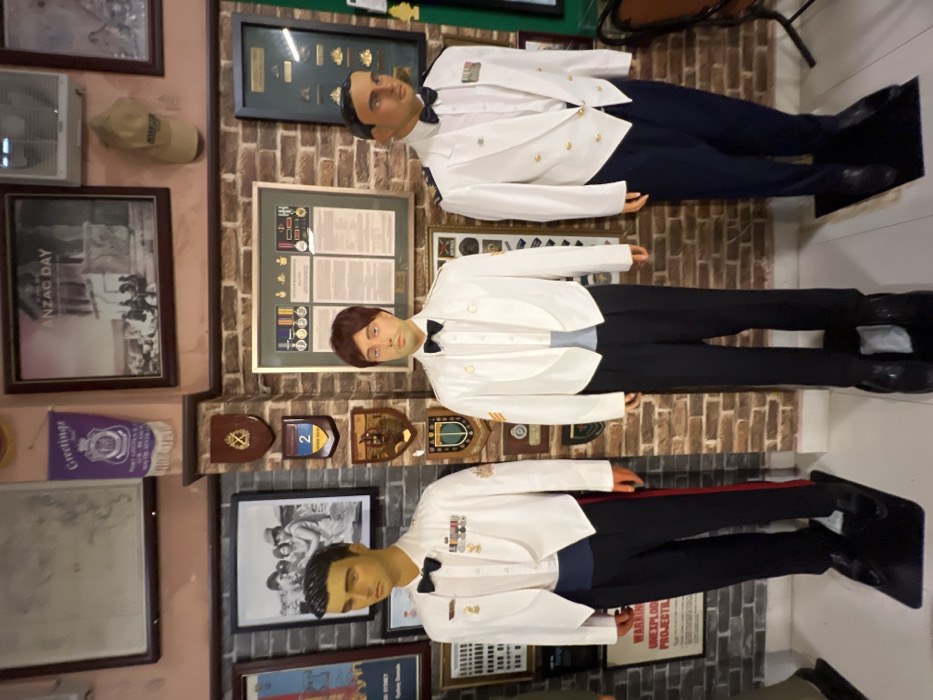 Three military mannequins stand shoulder to shoulder. Each wears a white uniform top with embellishments. Their pants vary in color: navy, black, and black with a red stripe. A variety of framed pictures and certificates adorn the wall behind them, including an Anzac Day poster and several commemorative military displays. The background appears to be a brick wall.