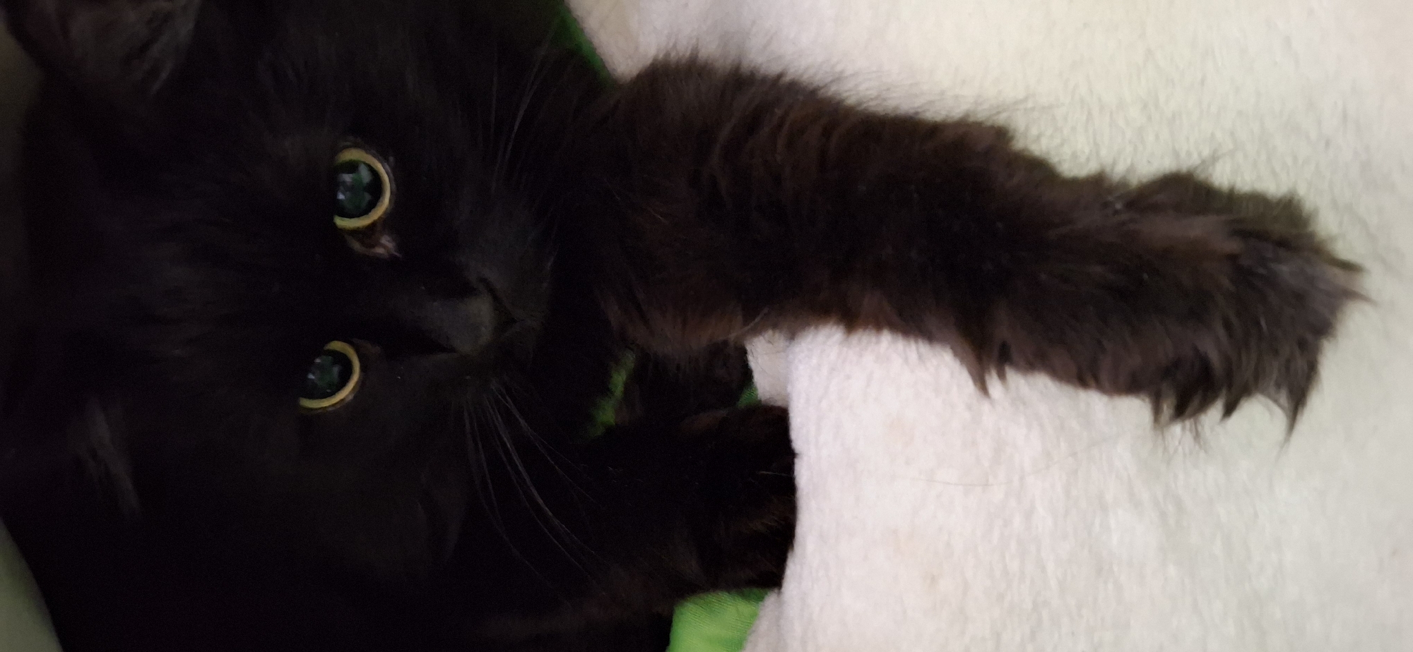 A black cat with green eyes is partially visible in the image. The cat's face is mostly in shadow, but its eyes are clearly visible. One of its paws is resting on a white, plush surface. A small area of green fabric is visible beneath the cat's face. The specific location in Chaikovsky, Russia cannot be determined from the image.