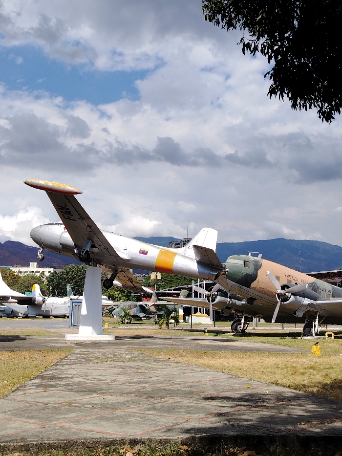 Several airplanes are displayed outdoors on stands and the ground at an aviation museum. A silver jet with the colors of Venezuela on its side is on a white stand. A camouflaged propeller plane sits on the ground to its right, bearing the words "Fuerza Aerea Venezolana". Mountains are visible in the background under a cloudy sky. A concrete pathway leads towards the aircraft.
