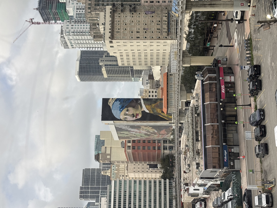 An elevated, wide-angle urban scene captures a portion of Downtown Miami, Florida, under an overcast sky. In the mid-ground, a large-scale mural, a rendering of Johannes Vermeer's "Girl with a Pearl Earring," covers the western facade of a multi-story building, identified as the Alfred I. duPont Building at 169 E Flagler St. Below this, an elevated concrete Metromover track traverses the scene horizontally, with a small, red-tiled roof structure positioned above it. In the immediate foreground, a low-rise commercial building with dark-tinted upper-floor windows and ground-level storefronts displays "Budget" and "AVIS" signage. Its flat roof is covered with multiple HVAC units and cylindrical structures. Adjacent to this building, a paved parking lot contains approximately ten parked vehicles, primarily sedans and SUVs, along with a white pickup truck and a white van near a green construction fence. A street runs parallel to the commercial building, featuring traffic signals, streetlights, and a bike share station. The background is dominated by a dense array of multi-story and high-rise buildings, characteristic of a central business district. A red construction crane is visible above the taller structures on the right, indicating ongoing development. No individuals are clearly identifiable within the frame.