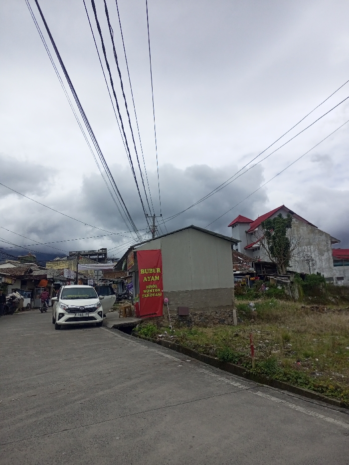 A street scene under a cloudy sky. A white car is parked on the left. A red banner that reads "BUBUR AYAM, RISOL, WONTON, TAKOYAKI" hangs next to a small, plain building. Utility poles and wires crisscross the sky. A larger building with a red roof is set back on a rise in the background. Overgrown vegetation is along the side of the road. Some houses in the background are visible.