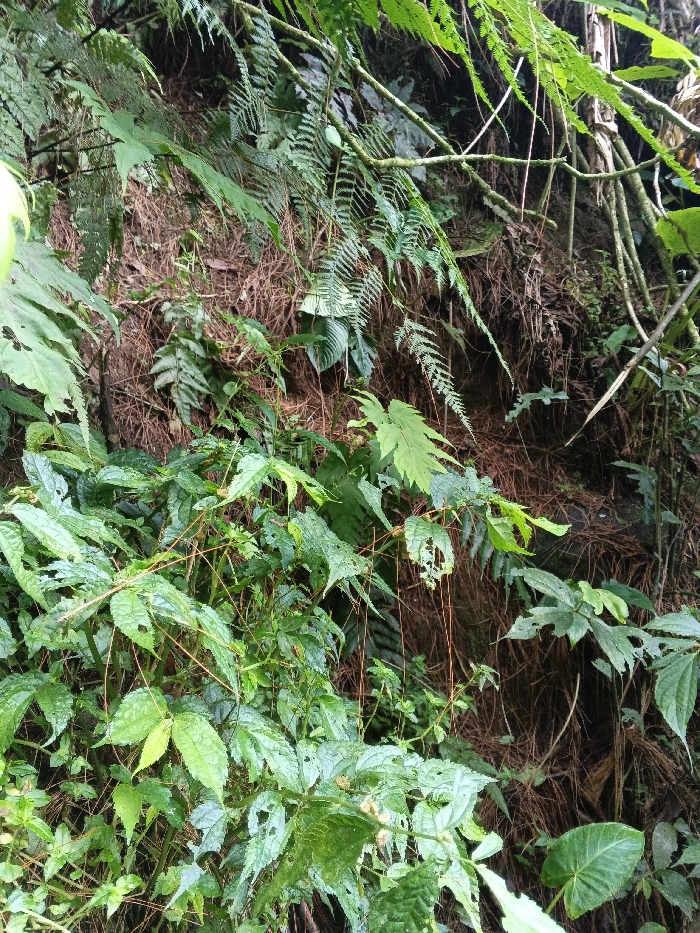 The image displays a dense, overgrown natural environment on an incline in Desa Mburukulu, Indonesia. The scene is dominated by various types of green foliage. In the immediate foreground, numerous broadleaf plants with serrated edges and visible insect damage (holes) are prominent, intertwined with thin, reddish-brown stems or vines. The midground features a dense array of ferns with delicate fronds and other lighter green leafy plants. The background reveals a steep earthen bank or wall, largely covered with dry, brown, fibrous plant matter, possibly roots or decaying vegetation, with darker soil patches interspersed. Several thicker, lighter-colored vertical plant stalks are visible on the upper right side of the embankment. No human presence, animals, or artificial objects are discernible within the frame. The lighting appears diffused, suggesting a shaded or overcast condition.