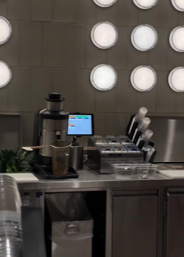 commercial kitchen setting. The background features a gray tiled wall adorned with circular lights arranged in a grid pattern. In the foreground, a stack of cups is visible. Further into the scene, a countertop holds various items, including a juicer with a container, a computer screen, a tray of small ingredients, and a pile of green vegetables. The counter continues to the right, where a person in a black uniform and baseball cap is handling bottles of condiments. The environment appears clean and organized, with stainless steel surfaces and ample counter space.