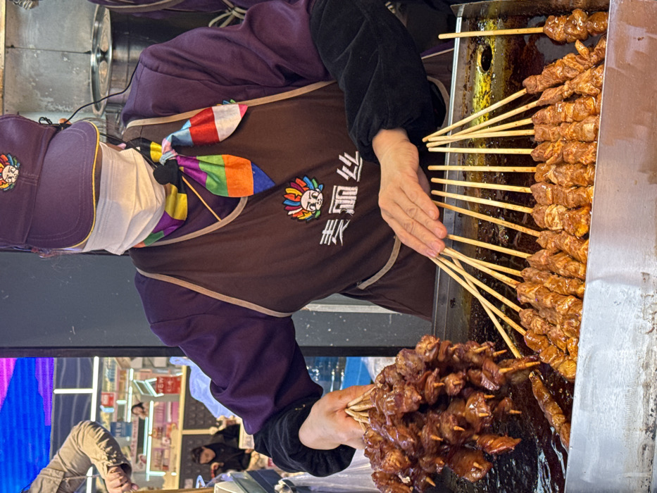 A person in a purple uniform with a colorful bow tie and face mask stands by a grill, cooking meat skewers. The skewers are arranged neatly on the grill, some raw and some cooked. The person holds a batch of cooked skewers in their hand. The grill appears to be outdoors, possibly a street food vendor. There is a blurry scene of what appears to be a storefront or indoor market visible behind the person.