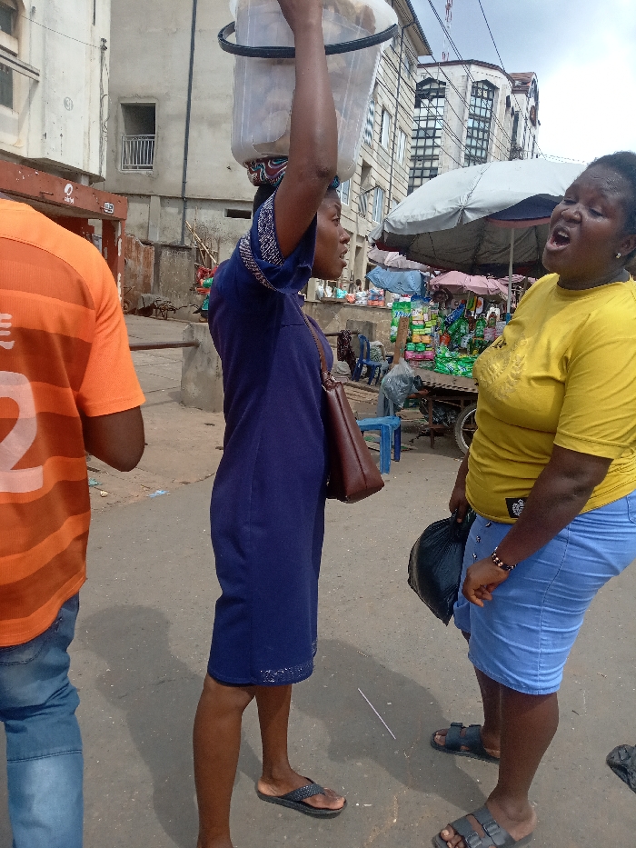 This image captures a street scene in Onitsha, Nigeria. In the foreground, three individuals are present. On the left, partially visible, is the back of a man wearing an orange horizontal-striped shirt and blue jeans. In the center, a woman of medium complexion, clad in a dark blue, short-sleeved dress with a patterned cuff and dark flip-flops, balances a clear plastic bucket containing light-colored items on her head, supported by her raised right arm. She carries a brown shoulder bag and wears a patterned headwrap; her mouth is slightly open, facing right. To her right, a second woman of fuller build, medium complexion, wears a yellow short-sleeved t-shirt, light blue denim shorts, and black sandals. Her mouth is wide open, suggesting active speech or a strong reaction, and she holds a black plastic bag in her left hand, facing left towards the first woman. The background features a commercial market environment with multi-story concrete buildings, some with balconies and metal window grates. Market stalls are visible under a large grey umbrella and a smaller pink one, displaying various packaged goods on a wooden cart, alongside blue plastic stools and a metal handcart. The ground is a paved street, appearing worn.