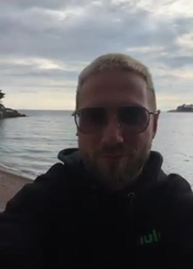 A man with short, bleached-blond hair, a beard, and sunglasses is recording a selfie video at a beach