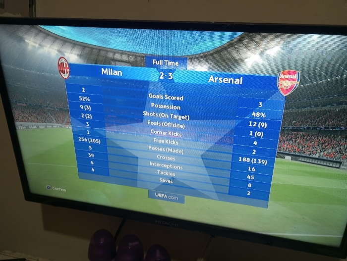 A television screen displays the "Full Time" statistics of a virtual football match between Milan (2 goals) and Arsenal (3 goals), with their respective club crests shown