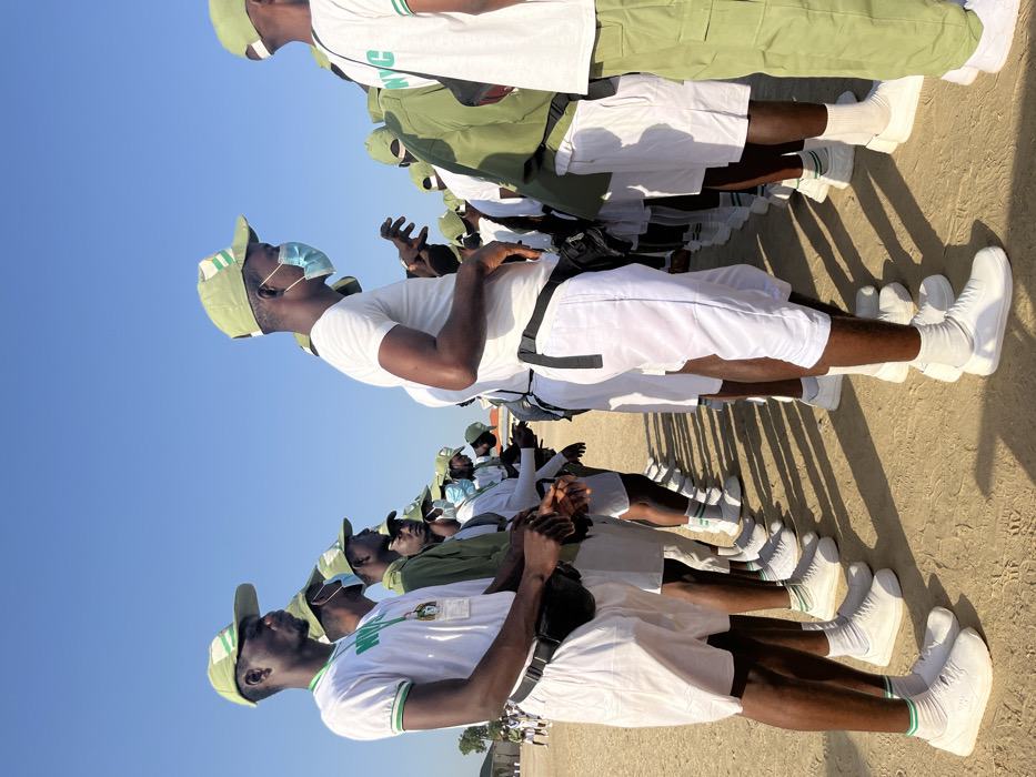 A line of people wearing white uniforms and green hats are standing outdoors. The uniforms consist of white shirts, white shorts, white socks, and white shoes. Some wear face masks. Some are wearing green jackets over their shirts. The background is a clear blue sky and beige ground. They appear to be at attention or performing some kind of drill.