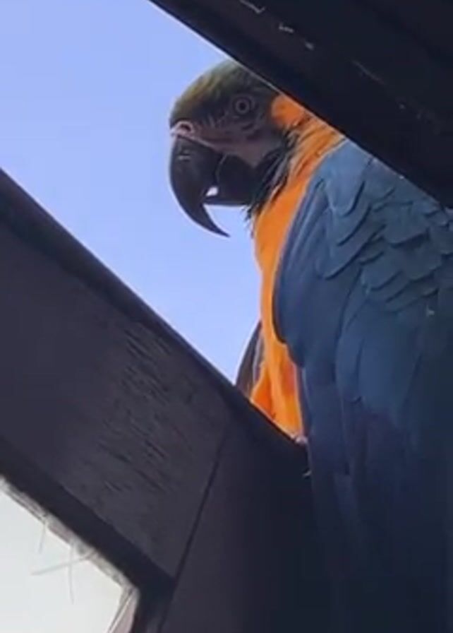 close-up, low-angle shot of a blue and gold macaw perched on a dark wooden structure, possibly a window frame or part of a building
